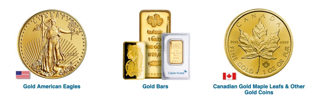 The collection extends to international offerings, including South African Krugerrands and Australian Kangaroos.