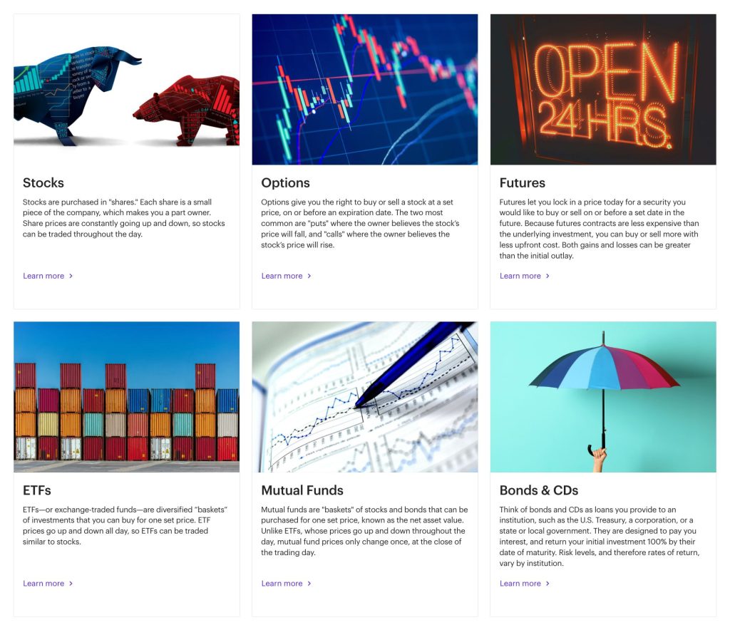 E*TRADE’s Knowledge Center organizes educational materials across seven core investment categories: stocks, ETFs, options, mutual funds, fixed income, retirement planning, and tax strategies.