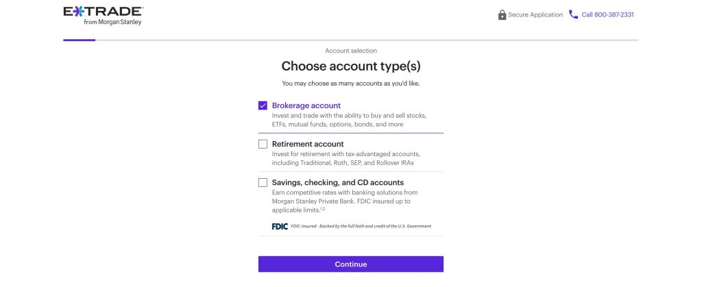 You’ll select from three account categories: brokerage, retirement, or banking. Each category offers individual, joint, or custodial options.