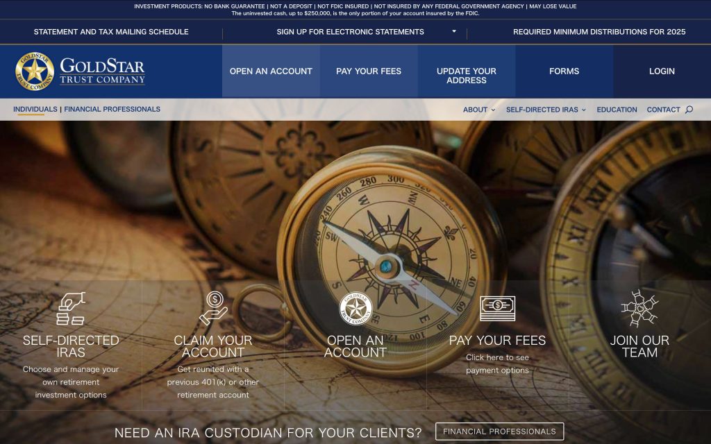 - 34+ Years of Experience: GoldStar Trust manages over $3 billion in assets across 60,000+ accounts, demonstrating stability since 1989.
