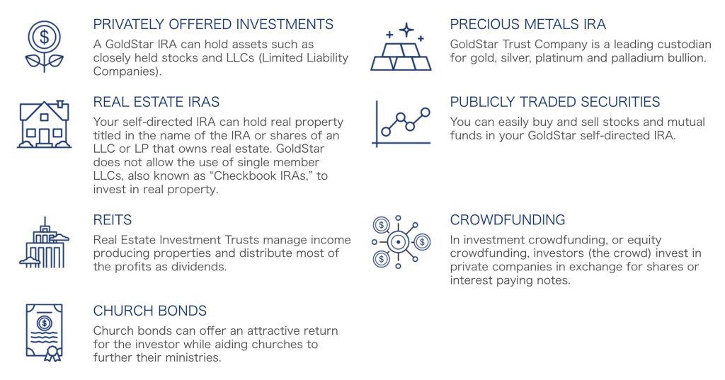 Your investment choices range from physical precious metals to private equity stakes. GoldStar Trust processes transactions, maintains records, and ensures each investment meets IRS regulations.
