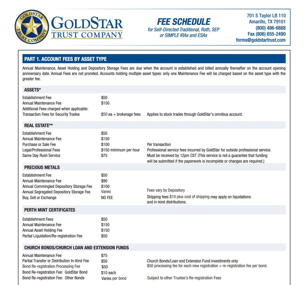 GoldStar Trust posts their complete fee schedule online, letting you calculate exact costs before opening an account.