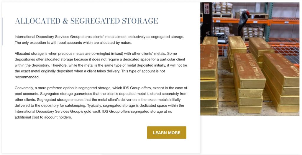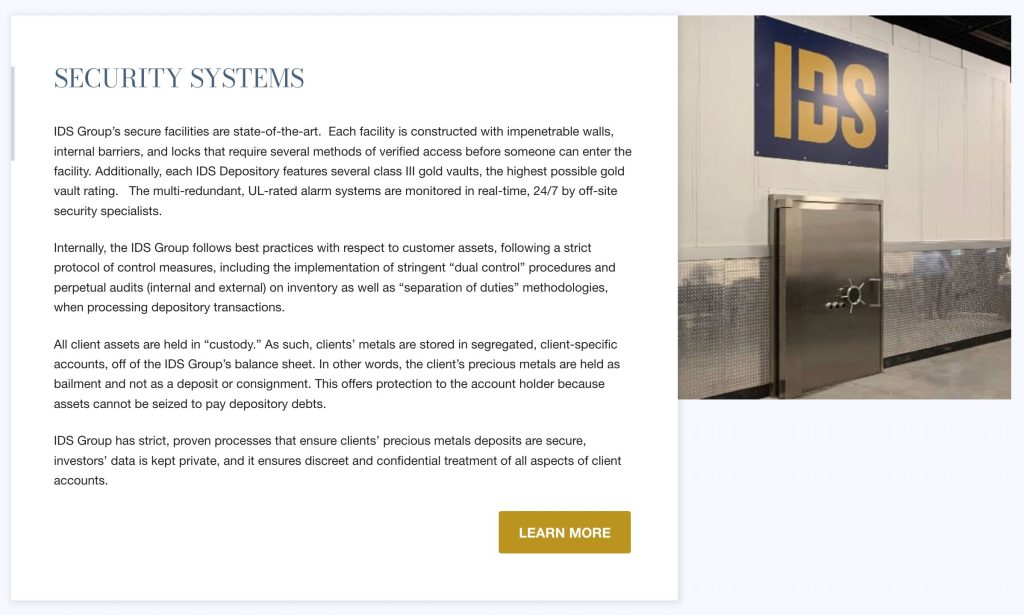 IDS Group specializes in physical storage of gold, silver, platinum, and palladium for IRA accounts and private holdings.