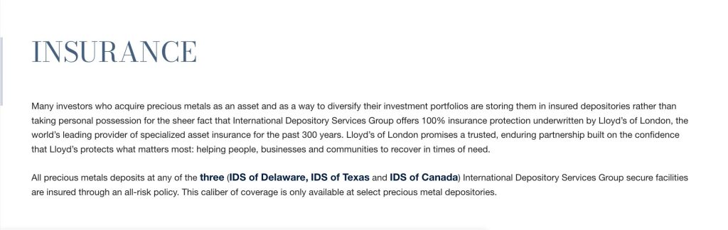 While IDS doesn’t publish complete policy details publicly, their use of Lloyd’s indicates coverage structured specifically for precious metals storage risks.
