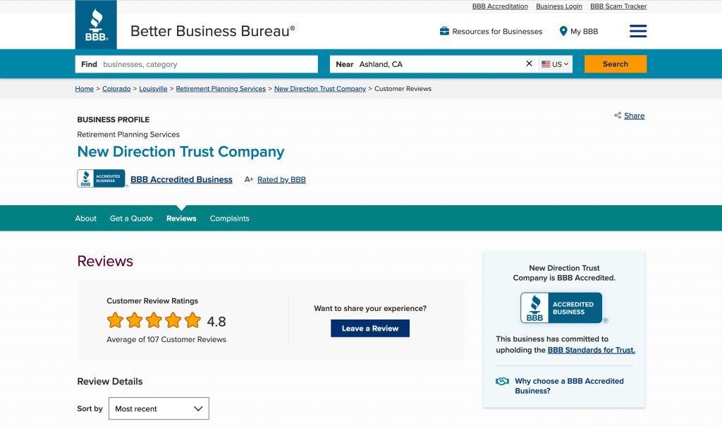 New Direction Trust Company maintains an A+ Better Business Bureau rating with 19 years of continuous accreditation.