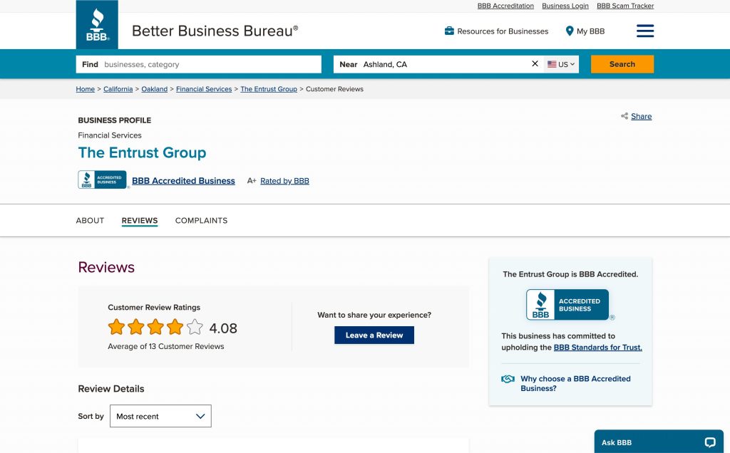The Entrust Group maintains an A+ rating from the Better Business Bureau (BBB), demonstrating their commitment to resolving customer concerns.