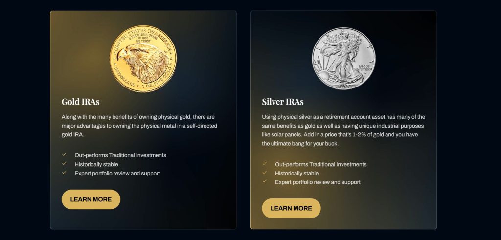 The Gold IRA service allows you to hold IRS-approved gold products including American Eagle coins, Canadian Maple Leafs, and Credit Suisse bars. Silver IRA options feature American Silver Eagles, Austrian Philharmonics, and 100-ounce bars for larger investments.