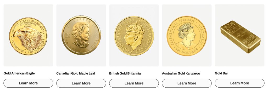 Your metal options include American Gold Eagles, Canadian Maple Leafs, and various silver bars meeting investment-grade standards.