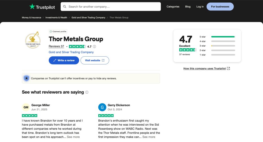 You’ll discover Thor Metals Group maintains a 4.7 out of 5 star rating on Trustpilot from 37 reviews, with 97% of customers awarding five stars.