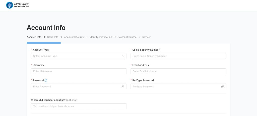 Opening an account with uDirect IRA Services requires specific documentation and a straightforward application process. We found their setup takes approximately 10-15 minutes online with the right paperwork ready.